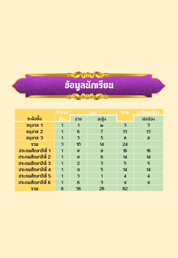 - จำนวนนักเรียนทั้งสิ้น 86 คน จำแนกตามระดับชั้นที่เปิดสอน