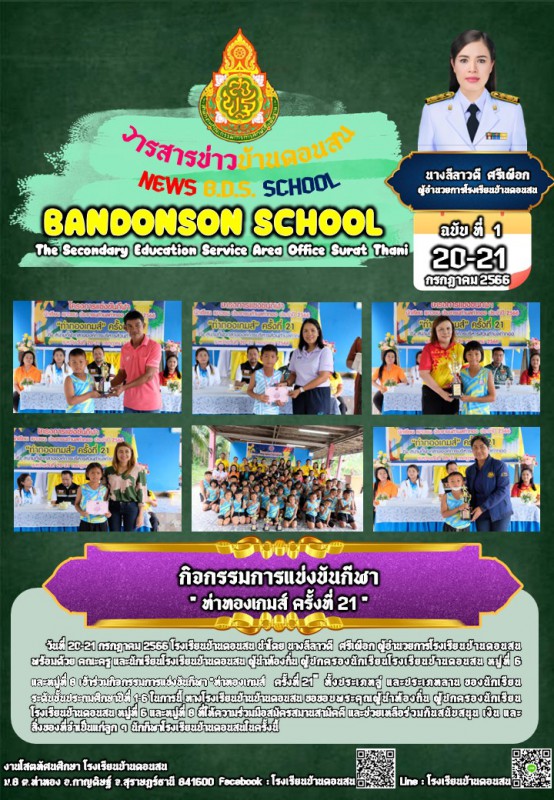 วันที่ 20-21 กรกฎาคม 2566 โรงเรียนบ้านดอนสน นำโดย นางลีลาวดี ศรีเผือก ผู้อำนวยการโรงเรียนบ้านดอนสน พร้อมด้วย คณะครู และนักเรียนโรงเรียนบ้านดอนสน ผู้นำท้องถิ่น ผู้ปกครองนักเรียนโรงเรียนบ้านดอนสน หมู่ที่ 6 และหมู่ที่ 8 เข้าร่วมกิจกรรมการแข่งขันกีฬา “ท่าทองเกมส์ครั้งที่ 21” ทั้งประเภทลู่ และประเภทลาน ของนักเรียนระดับชั้นประถมศึกษาปีที่ 1–6 ในการนี้ ทางโรงเรียนบ้านบ้านดอนสน ขอขอบพระคุณผู้นำท้องถิ่น ผู้ปกครองนักเรียนโรงเรียนบ้านดอนสน หมู่ที่ 6 และหมู่ที่ 8 ที่ให้ความร่วมมือสมัครสมานสามัคคี และช่วยเหลือร่วมกันสนับสนุน เงิน และสิ่งของที่จำเป็นแก่ลูก ๆ นักกีฬาโรงเรียนบ้านดอนสนในครั้งนี้