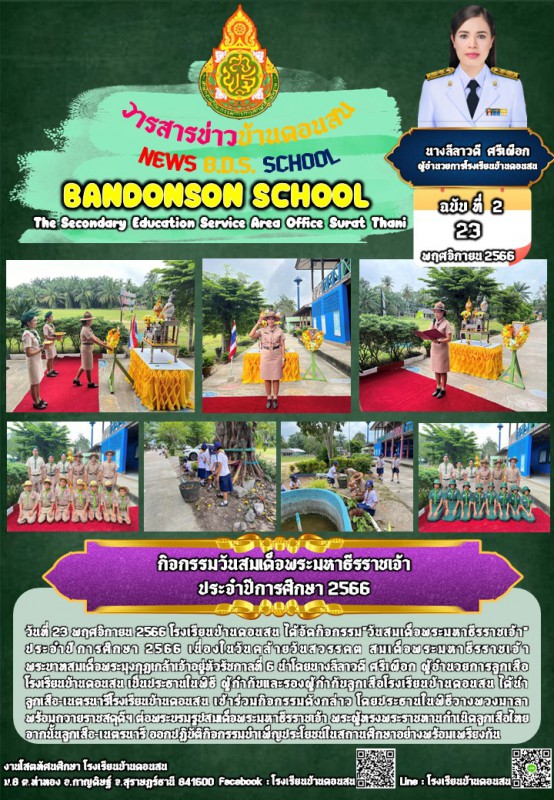 วันที่ 23 พฤศจิกายน 2566 โรงเรียนบ้านดอนสน ได้จัดกิจกรรม”วันสมเด็จพระมหาธีรราชเจ้า”ประจำปีการศึกษา 2566 เนื่องในวันคล้ายวันสวรรคต สมเด็จพระมหาธีรราชเจ้าพระบาทสมเด็จพระมุงกุฎเกล้าเจ้าอยู่หัวรัชกาลที่ 6 นำโดยนางลีลาวดี ศรีเผือก ผู้อำนวยการลูกเสือโรงเรียนบ้านดอนสน เป็นประธานในพิธีผู้กำกับและรองผู้กำกับลูกเสือโรงเรียนบ้านดอนสนได้นำลูกเสือ-เนตรนารีโรงเรียนบ้านดอนสนเข้าร่วมกิจกรรมดังกล่าวโดยประธานในพิธีวางพวงมาลา พร้อมถวายราชสดุดีฯ ต่อพระบรมรูปสมเด็จพระมหาธีรราชเจ้าพระผู้ทรงพระราชทานกำเนิดลูกเสือไทยจากนั้นลูกเสือ-เนตรนารี ออกปฏิบัติกิจกรรมบำเพ็ญประโยชน์ในสถานศึกษาอย่างพร้อมเพรียงกัน |