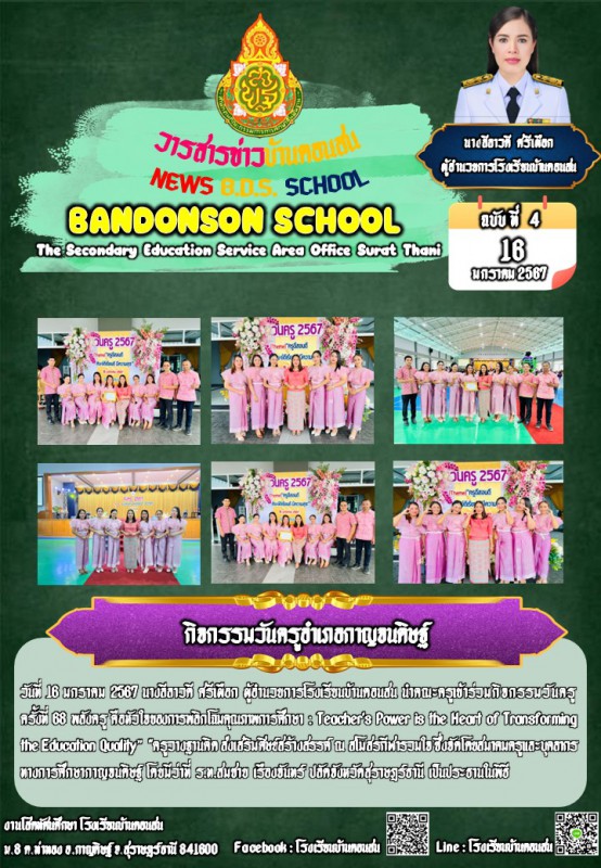 วันที่ 16 มกราคม 2567 นางลีลาวดี ศรีเผือก ผู้อำนวยการโรงเรียนบ้านดอนสน นำคณะครูเข้าร่วมกิจกรรมวันครูครั้งที่ 68 พลังครู คือหัวใจของการพลิกโฉมคุณภาพการศึกษา : Teacher's Power is the Heart of Transforming the Education Quality” "ครูวางฐานคิด ส่งเสริมศิษย์สร้างสรรค์ ณ สโมสรกีฬารวมใจ ซึ่งจัดโดยสมาคมครูและบุคลากรทางการศึกษากาญจนดิษฐ์ โดยมีว่าที่ ร.ท.สมชาย เรืองจันทร์ ปลัดจังหวัดสุราษฎร์ธานี เป็นประธานในพิธี