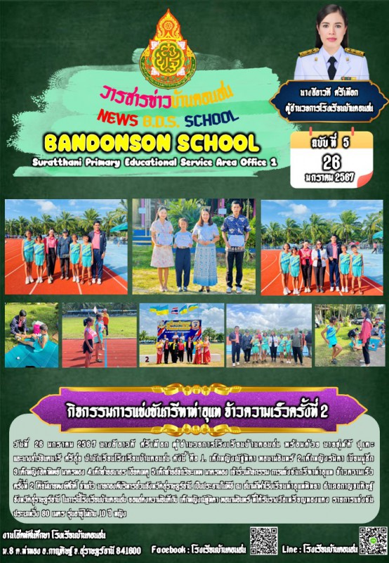เข้าร่วมกิจกรรม การแข่งขันกรีฑาท่าอุแท จ้าวความเร็ว ครั้งที่ 2 โดยมีนายพงษ์ศักดิ์ จ่าแก้ว นายกองค์บริหารส่วนจังหวัดสุราษฎร์ธานี เป็นประธานในพิธี ณ สนามกีฬาโรงเรียนท่าอุแทพิทยา อำเภอกาญจนดิษฐ์ จังหวัดสุราษฎร์ธานี ในการนี้โรงเรียนบ้านดอนสน ขอแสดงความยินดีกับ เด็กหญิงณัฐทิตา พลนามอินทร์ ที่ได้รับรางวัลเหรียญทองแดง รายการแข่งขันประเภทวิ่ง 80 เมตร รุ่นอายุไม่เกิน 10 ปี หญิง