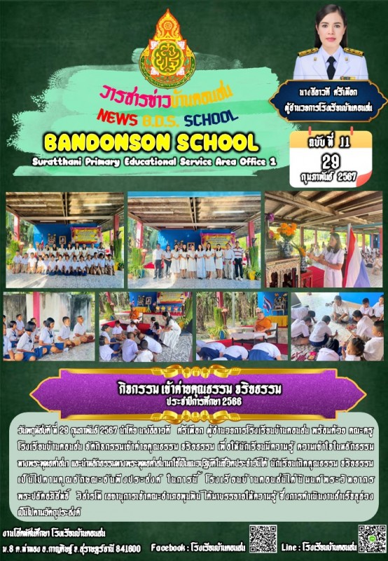 วันพฤหัสบดี ที่ 29 กุมภาพันธ์ 2567 นำโดย นางลีลาวดี ศรีเผือก ผู้อำนวยการโรงเรียนบ้านดอนสน พร้อมด้วย คณะครูโรงเรียนบ้านดอนสน จัดกิจกรรมเข้าค่ายคุณธรรม จริยธรรม เพื่อให้นักเรียนมีความรู้ ความเข้าใจในหลักธรรมทางพระพุทธศาสนา และนำหลักธรรมทางพระพุทธศาสนามาใช้เป็นแนวปฏิบัติในชีวิตประจำวันได้ นักเรียนเกิดคุณธรรม จริยธรรมเป็นไปตามคุณลักษณะอันพึงประสงค์ ในการนี้ โรงเรียนบ้านดอนสนได้นิมนต์พระวิทยากรพระปลัดอภิสิทธิ์ วิสารโท เลขานุการเจ้าคณะอำเภอพุนพิน ได้มาบรรยายให้ความรู้ ซึ่งการดำเนินงานสำเร็จลุล่วงเป็นไปตามวัตถุประสงค์ |