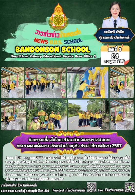 วันพุธ ที่ 27 กรกฎาคม 2566 นางลีลาวดี ศรีเผือก ผู้อำนวยการโรงเรียนบ้านดอนสนได้มอบหมายให้นางวรุณยุพา อิสระนูวัฒน์ พร้อมด้วยคณะครู และนักเรียนโรงเรียนบ้านดอนสน จัดกิจกรรมเนื่องในโอกาสวันคล้ายวันพระราชสมภพ พระบาทสมเด็จพระปรเมนทรรามาธิบดีศรีสินทรมหาวชิราลงกรณ พระวชิรเกล้าเจ้าอยู่หัว ประจำปีการศึกษา2567 เพื่อแสดงออกถึงความจงรักภักดี และน้อมรำลึกในพระมหากรุณาธิคุณของพระองค์ ในการนี้คณะครู และนักเรียนพร้อมใจกันทำกิจกรรมจิตอาสาบริเวณชุมชนของบ้านดอนสนโดยพร้อมเพรียงกัน
