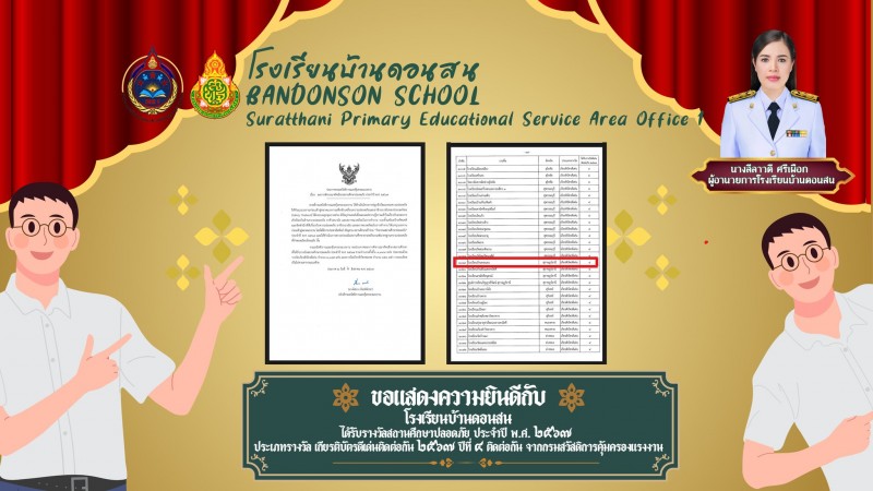 ขอแสดงความยินดีกับ โรงเรียนบ้านดอนสนได้รับรางวัลสถานศึกษาปลอดภัย ประจำปี พ.ศ. ๒๕๖๗ ประเภทรางวัล เกียรติบัตรดีเด่นติดต่อกัน ๒๕๖๗ ปีที่ ๔ ติดต่อกันจากกรมสวัสดิการคุ้มครองแรงงาน |