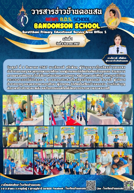 วันศุกร์ ที่ 9 สิงหาคม 2567 นางลีลาวดี ศรีเผือก ผู้อำนวยการโรงเรียนบ้านดอนสน นำข้าราชการครู และบุคลากรทางการศึกษา และผู้ปกครองนักเรียนโรงเรียนบ้านดอนสน ร่วมลงนามถวายพระพรชัยมงคล เนื่องในโอกาสวันเฉลิมพระชนมพรรษา สมเด็จพระนางเจ้าสิริกิติ์ พระบรมราชินีนาถ พระบรมราชชนนีพันปีหลวง ณ ลานอเนกประสงค์โรงเรียนบ้านดอนสน ในการนี้ ผู้บริหาร ข้าราชการครู และบุคลากรทางการศึกษา
