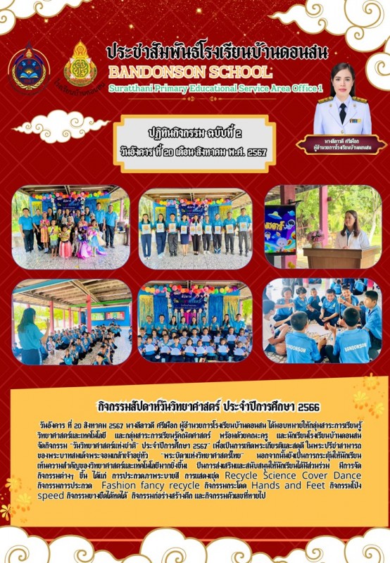 วันอังคาร ที่ 20 สิงหาคม 2567 นางลีลาวดี ศรีเผือก ผู้อำนวยการโรงเรียนบ้านดอนสน ได้มอบหมายให้กลุ่มสาระการเรียนรู้วิทยาศาสตร์และเทคโนโลยี และกลุ่มสาระการเรียนรู้คณิตศาสตร์ พร้อมด้วยคณะครู และนักเรียนโรงเรียนบ้านดอนสน จัดกิจกรรม “วันวิทยาศาสตร์แห่งชาติ” ประจำปีการศึกษา 2567” เพื่อเป็นการเทิดพระเกียรติและสดุดีในพระปรีชาสามารถของพระบาทสมเด็จพระจอมเกล้าเจ้าอยู่หัว“พระบิดาแห่งวิทยาศาสตร์ไทย”นอกจากนั้นยังเป็นการกระตุ้นให้นักเรียนเห็นความสำคัญของวิทยาศาสตร์และเทคโนโลยีมากยิ่งขึ้นเป็นการส่งเสริมและสนับสนุนให้นักเรียนได้มีส่วนร่วม มีการจัดกิจกรรมต่างๆ ขึ้น ได้แก่ การประกวดภาพระบายสี การแสดงเชุด Recycle Science Cover Dance กิจกรรมการประกวด Fashion fancy recycle กิจกรรมกระโดด Hands and Feet กิจกรรมโป่ง speed กิจกรรมยางยืดได้หดได้ กิจกรรมก่อร่างสร้างตึก และกิจกรรมตัวเลขที่หายไป |