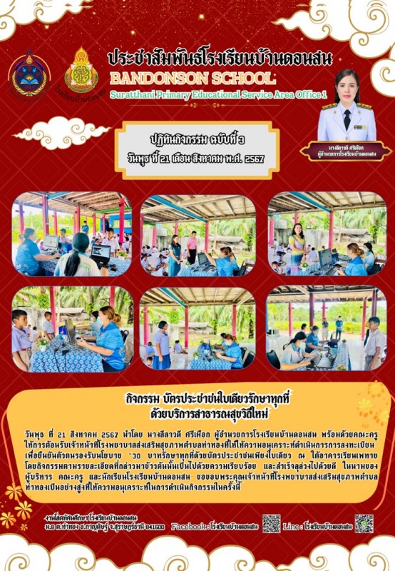 วันพุธ ที่ 21 สิงหาคม 2567 นำโดย นางลีลาวดี ศรีเผือก ผู้อำนวยการโรงเรียนบ้านดอนสน พร้อมด้วยคณะครูให้การต้อนรับเจ้าหน้าที่โรงพยาบาลส่งเสริมสุขภาพตำบลท่าทองที่ให้ให้ความอนุเคราะห์ดำเนินการการลงทะเบียนเพื่อยืนยันตัวตนรองรับนโยบาย “30 บาทรักษาทุกที่ด้วยบัตรประชาชนเพียงใบเดียว ณ ใต้อาคารเรียน เพทายโดยกิจกรรมตามรายละเอียดที่กล่าวมาข้าวต้นนั้นเป็นไปด้วยความเรียบร้อย และสำเร็จลุล่วงไปด้วยดี ในนามของผู้บริหาร คณะครู และนักเรียนโรงเรียนบ้านดอนสน ขอขอบพระคุณเจ้าหน้าที่โรงพยาบาลส่งเสริมสุขภาพตำบล ท่าทองเป็นอย่างสูงที่ให้ความอนุเคราะห์ในการดำเนินกิจกรรมในครั้งนี้