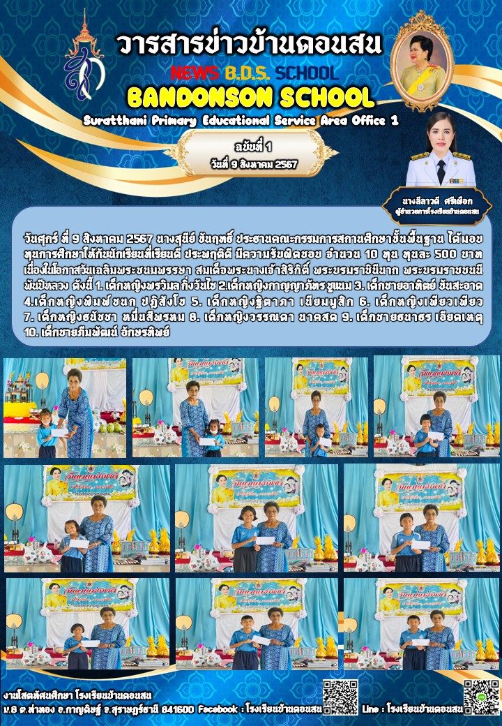 ได้มอบทุนการศึกษาให้กับนักเรียนที่เรียนดี ประพฤติดี มีความรับผิดชอบ จำนวน 10 ทุน ทุนละ 500 บาท เนื่องในโอกาสวันเฉลิมพระชนมพรรษา สมเด็จพระนางเจ้าสิริกิติ์ พระบรมราชินีนาถ พระบรมราชชนนีพันปีหลวง ดังนี้