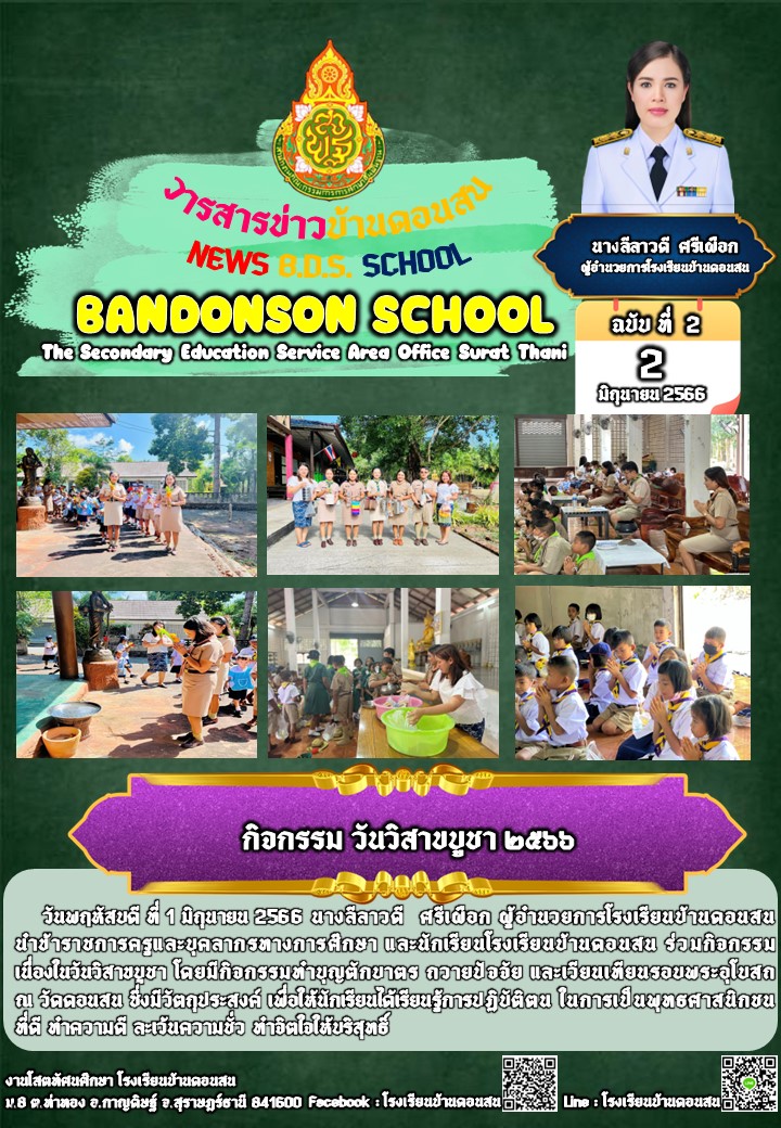 วันพฤหัสบดี ที่ 1 มิถุนายน 2566 นางลีลาวดี ศรีเผือก ผู้อำนวยการโรงเรียนบ้านดอนสน นำข้าราชการครูและบุคลากรทางการศึกษา และนักเรียนโรงเรียนบ้านดอนสน ร่วมกิจกรรมเนื่องในวันวิสาขบูชา โดยมีกิจกรรมทำบุญตักบาตร ถวายปัจจัย และเวียนเทียนรอบพระอุโบสถ ณ วัดดอนสน ซึ่งมีวัตถุประสงค์ เพื่อให้นักเรียนได้เรียนรู้การปฏิบัติตน ในการเป็นพุทธศาสนิกชนที่ดี ทำความดี ละเว้นความชั่ว ทำจิตใจให้บริสุทธิ์