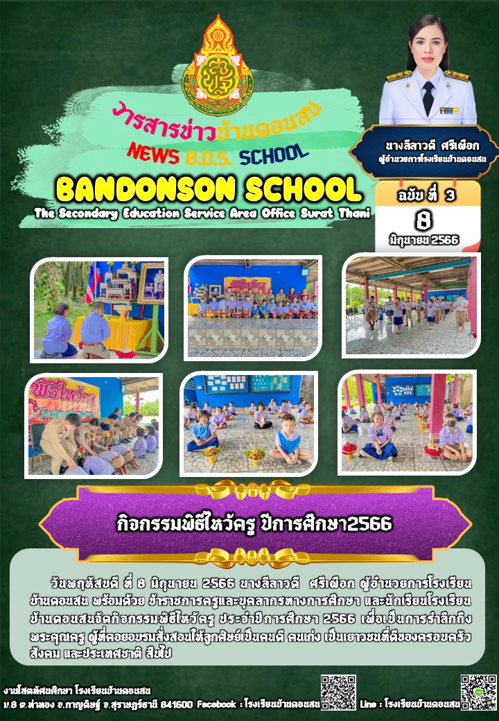 วันพฤหัสบดี ที่ 8 มิถุนายน 2566 นางลีลาวดี ศรีเผือก ผู้อำนวยการโรงเรียนบ้านดอนสน พร้อมด้วย ข้าราชการครูและบุคลากรทางการศึกษา และนักเรียนโรงเรียนบ้านดอนสนจัดกิจกรรมพิธีไหว้ครู ประจำปีการศึกษา 2566 เพื่อเป็นการรำลึกถึงพระคุณครู ผู้ที่คอยอบรมสั่งสอนให้ลูกศิษย์เป็นคนดี คนเก่ง เป็นเยาวชนที่ดีของครอบครัว สังคม และประเทศชาติ สืบไป
