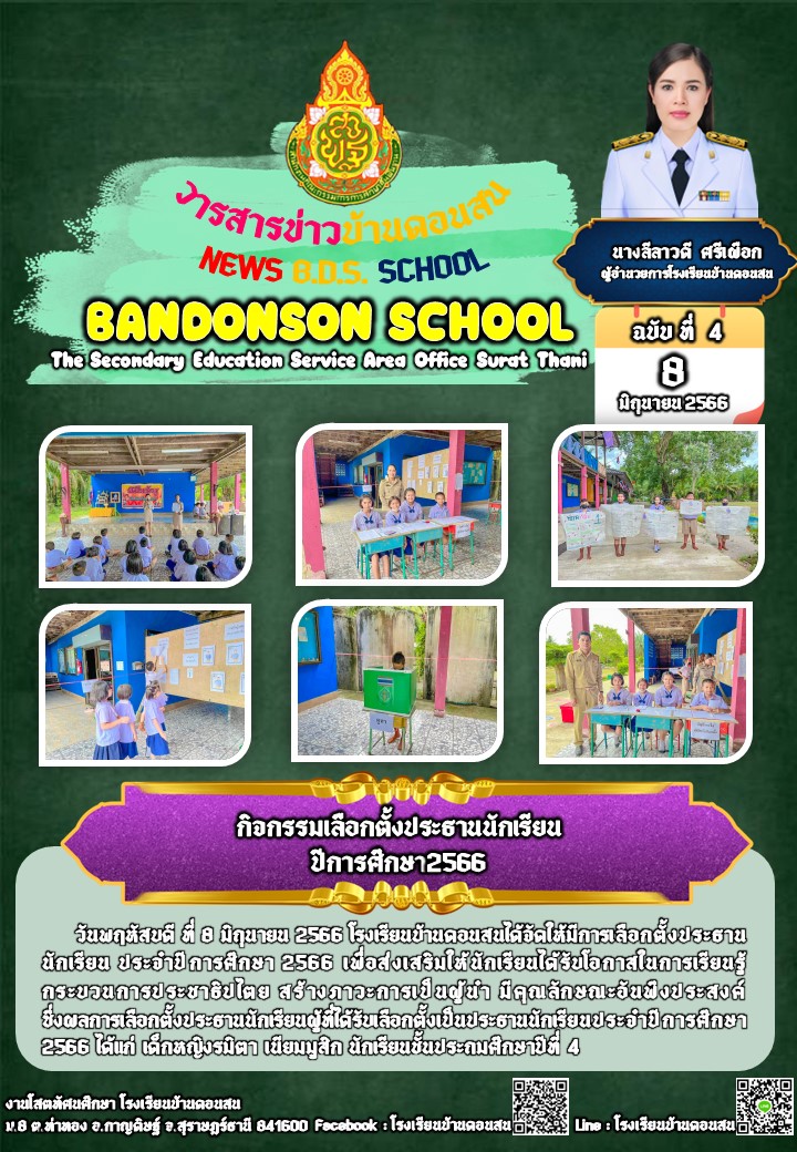 วันพฤหัสบดี ที่ 8 มิถุนายน 2566 โรงเรียนบ้านดอนสนได้จัดให้มีการเลือกตั้งประธานนักเรียน ประจำปีการศึกษา 2566 เพื่อส่งเสริมให้นักเรียนได้รับโอกาสในการเรียนรู้กระบวนการประชาธิปไตย สร้างภาวะการเป็นผู้นำ มีคุณลักษณะอันพึงประสงค์ ซึ่งผลการเลือกตั้งประธานนักเรียนผู้ที่ได้รับเลือกตั้งเป็นประธานนักเรียนประจำปีการศึกษา 2566 ได้แก่ เด็กหญิงรมิตา เนียมมูสิก นักเรียนชั้นประถมศึกษาปีที่ 4