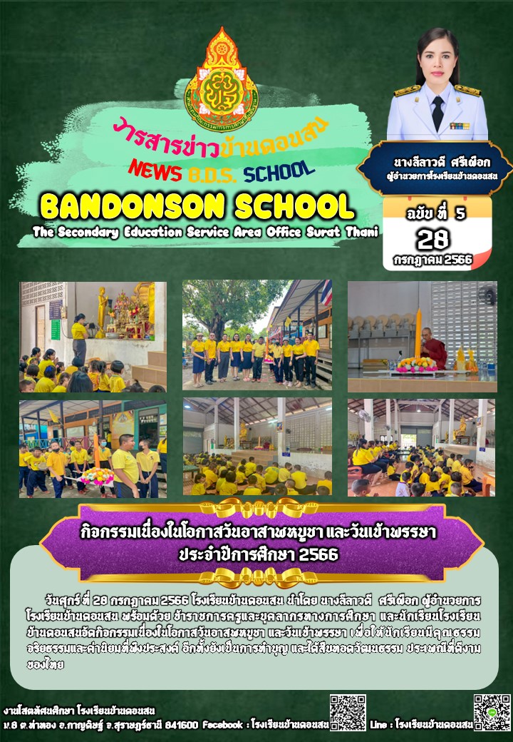 วันศุกร์ ที่ 28 กรกฎาคม 2566 โรงเรียนบ้านดอนสน นำโดย นางลีลาวดี ศรีเผือก ผู้อำนวยการโรงเรียนบ้านดอนสน พร้อมด้วย ข้าราชการครูและบุคลากรทางการศึกษาและนักเรียนโรงเรียนบ้านดอนสนจัดกิจกรรมเนื่องในโอกาสวันอาสฬหบูชาและวันเข้าพรรษาเพื่อให้นักเรียนมีคุณธรรม จริยธรรมและค่านิยมที่พึงประสงค์ อีกทั้งยังเป็นการทำบุญ และได้สืบทอดวัฒนธรรม ประเพณีที่ดีงามของไทย