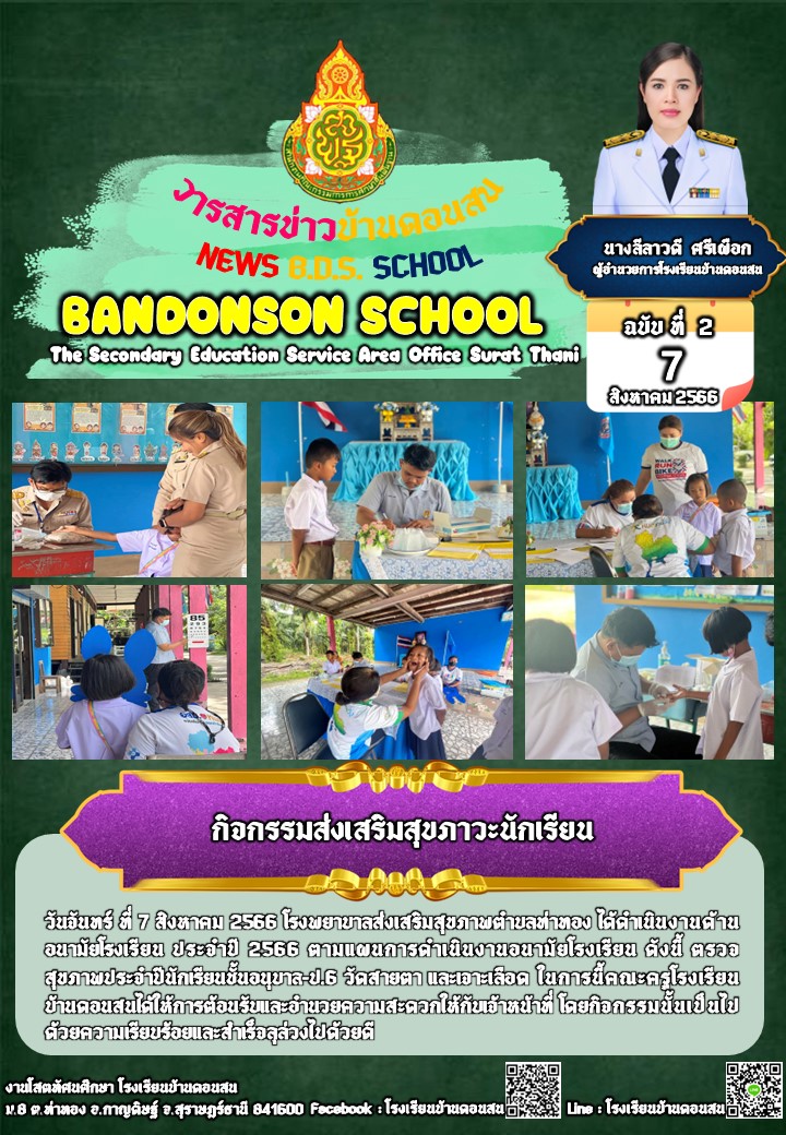 วันจันทร์ ที่ 7 สิงหาคม 2566 โรงพยาบาลส่งเสริมสุขภาพตำบลท่าทอง ได้ดำเนินงานด้านอนามัยโรงเรียน ประจำปี 2566 ตามแผนการดำเนินงานอนามัยโรงเรียน ดังนี้ ตรวจสุขภาพประจำปีนักเรียนชั้นอนุบาล-ป.6 วัดสายตา และเจาะเลือด ในการนี้คณะครูโรงเรียนบ้านดอนสนได้ให้การต้อนรับและอำนวยความสะดวกให้กับเจ้าหน้าที่ โดยกิจกรรมนั้นเป็นไปด้วยความเรียบร้อยและสำเร็จลุล่วงไปด้วยดี