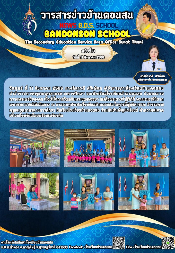 วันศุกร์ ที่ 11 สิงหาคม 2566 นางลีลาวดี ศรีเผือก ผู้อำนวยการโรงเรียนบ้านดอนสนนำข้าราชการครูและบุคลากรทางการศึกษา และนักเรียนโรงเรียนบ้านดอนสน ร่วมลงนามถวายพระพรชัยมงคล เนื่องในโอกาสวันเฉลิมพระชนมพรรษาสมเด็จพระนางเจ้าสิริกิติ์ พระบรมราชินีนาถ พระบรมราชชนนีพันปีหลวง ณ ลานอเนกประสงค์โรงเรียนบ้านดอนสน ในการนี้ผู้บริหารและ ข้าราชการครูและบุคลากรทางการศึกษา นักเรียนโรงเรียนบ้านดอนสน ร่วมกันบำเพ็ญประโยชน์ ทำความสะอาดบริเวณโรงเรียนโดยพร้อมเพรียงกัน