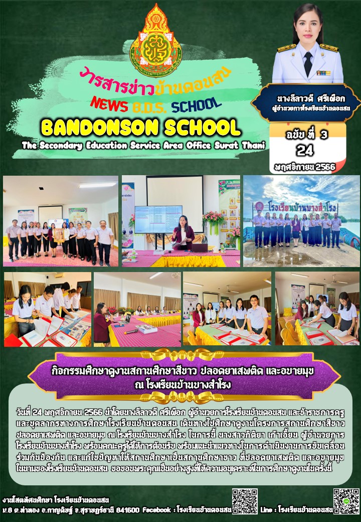 วันที่ 24 พฤศจิกายน 2566 นำโดยนางลีลาวดี ศรีเผือก ผู้อำนวยการโรงเรียนบ้านดอนสน และข้าราชการครูและบุคลากรทางการศึกษาโรงเรียนบ้านดอนสน เดินทางไปศึกษาดูงานโครงการสถานศึกษาสีขาว ปลอดยาเสพติด และอบายมุข ณ โรงเรียนบ้านบางสำโรง ในการนี้ นางสาวกิติยา เก้าเอี้ยน ผู้อำนวยการโรงเรียนบ้านบางสำโรง พร้อมคณะครูได้ให้การต้อนรับ พร้อมแนะนำแนวทางในการดำเนินงานการขับเคลื่อนร่วมกันป้องกัน และแก้ไขปัญหาให้สถานศึกษาเป็นสถานศึกษาขาว ที่ปลอดยาเสพติด และอบายมุข ในนามของโรงเรียนบ้านดอนสน ขอขอบพระคุณเป็นอย่างสูงที่ให้ความอนุเคราะห์ในการศึกษาดูงานในครั้งนี้