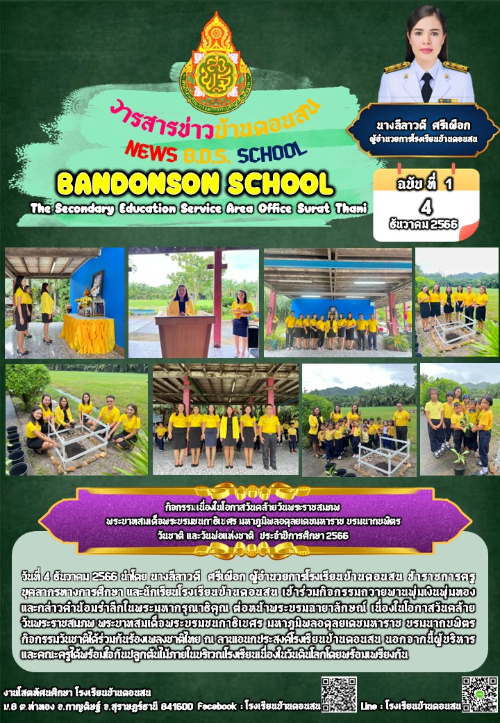 วันที่ 4 ธันวาคม 2566 นำโดย นางลีลาวดี ศรีเผือก ผู้อำนวยการโรงเรียนบ้านดอนสน ข้าราชการครู บุคลากรทางการศึกษา และนักเรียนโรงเรียนบ้านดอนสน เข้าร่วมกิจกรรมถวายพานพุ่มเงินพุ่มทองและกล่าวคำน้อมรำลึกในพระมหากรุณาธิคุณ ต่อหน้าพระบรมฉายาลักษณ์ เนื่องในโอกาส วันคล้ายวันพระราชสมภพพระบาทสมเด็จพระบรมชนกาธิเบศร มหาภูมิพลอดุลยเดชมหาราช บรมนาถบพิตร กิจกรรมวันชาติได้ร่วมกันร้องเพลงชาติไทย ณ ลานเอนกประสงค์โรงเรียนบ้านดอนสน นอกจากนี้ผู้บริหาร และคณะครูได้พร้อมใจกันปลูกต้นไม้ภายในบริเวณโรงเรียนเนื่องในวันดินโลกโดยพร้อมเพรียงกัน