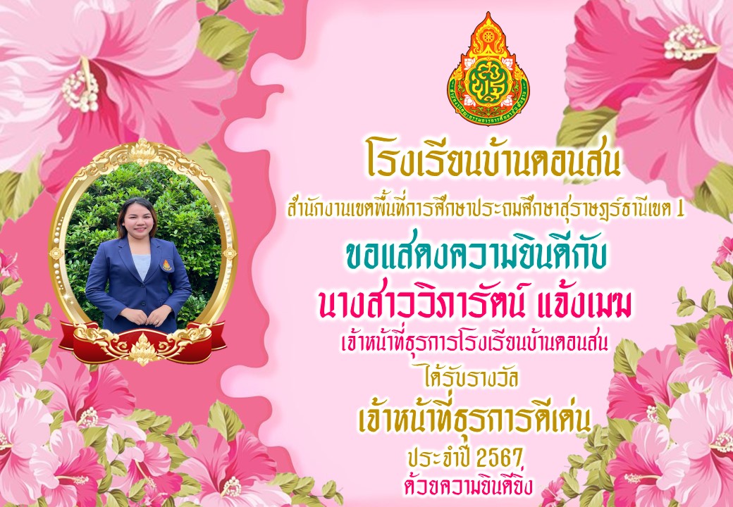 โรงเรียนบ้านดอนสน สำนักงานเขตพื้นที่การศึกษาประถมศึกษาสุราษฎร์ธานีเขต1 ขอแสดงความยินดีกับนางสาววิภารัตน์ แจ้งเมฆเจ้าหน้าที่ธุรการโรงเรียนบ้านดอนสน ได้รับรางวัล เจ้าหน้าที่ธุรการดีเด่น ประจำปี 2567 ด้วยความยินดียิ่ง