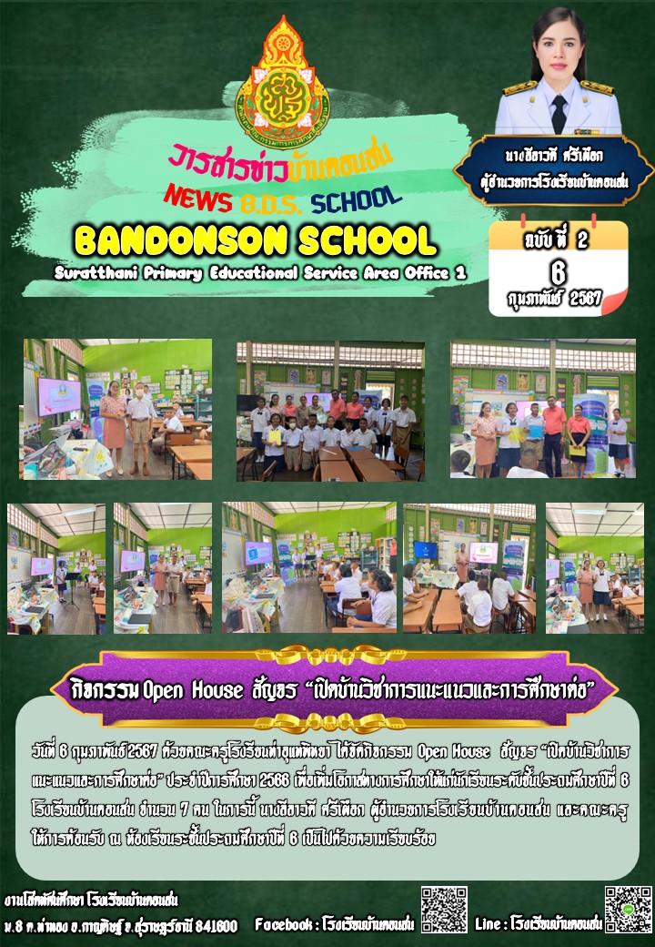 วันที่ 6 กุมภาพันธ์ 2567 ด้วยคณะครูโรงรียนท่าอุแทพิทยา ได้จัดกิจกรรม Open House สัญจร “เปิดบ้านวิชาการแนะแนวและการศึกษาต่อ” ประจำปีการศึกษา 2566 เพื่อเพิ่มโอกาสทางการศึกษาให้แก่นักเรียนระดับชั้นประถมศึกษาปีที่ 6 โรงเรียนบ้านดอนสน จำนวน 7 คน ในการนี้ นางลีลาวดี ศรีเผือก ผู้อำนวยการโรงเรียนบ้านดอนสน และคณะครูให้การต้อนรับ ณ ห้องเรียนระชั้นประถมศึกษาปีที่ 6 เป็นไปด้วยความเรียบร้อย