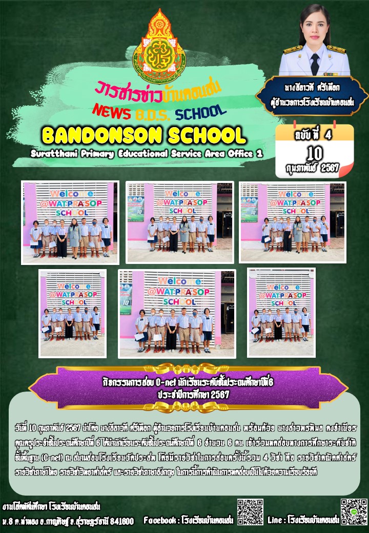 วันที่ 10 กุมภาพันธ์ 2567 นำโดย นางลีลาวดี ศรีเผือก ผู้อำนวยการโรงเรียนบ้านดอนสน พร้อมด้วย นางสาวพรพิมล คงจำเนียรคุณครูประจำชั้นประถมศึกษาปีที่ 6 ได้นำนักเรียนระดับชั้นประถมศึกษาปีที่ 6 จำนวน 6 คน เข้าร่วมทดสอบทางการศึกษาระดับชาติขั้นพื้นฐาน (O-net) ณ สนามสอบโรงเรียนวัดประสพ โดยมีรายวิชาในการสอบครั้งนี้รวม 4 วิชา คือ รายวิชาคณิตศาสตร์รายวิชาภาษาไทย รายวิชาวิทยาศาสตร์ และรายวิชาภาษาอังกฤษ ในการนี้การดำเนินการทดสอบเป็นไปด้วยความเรียบร้อยดี
