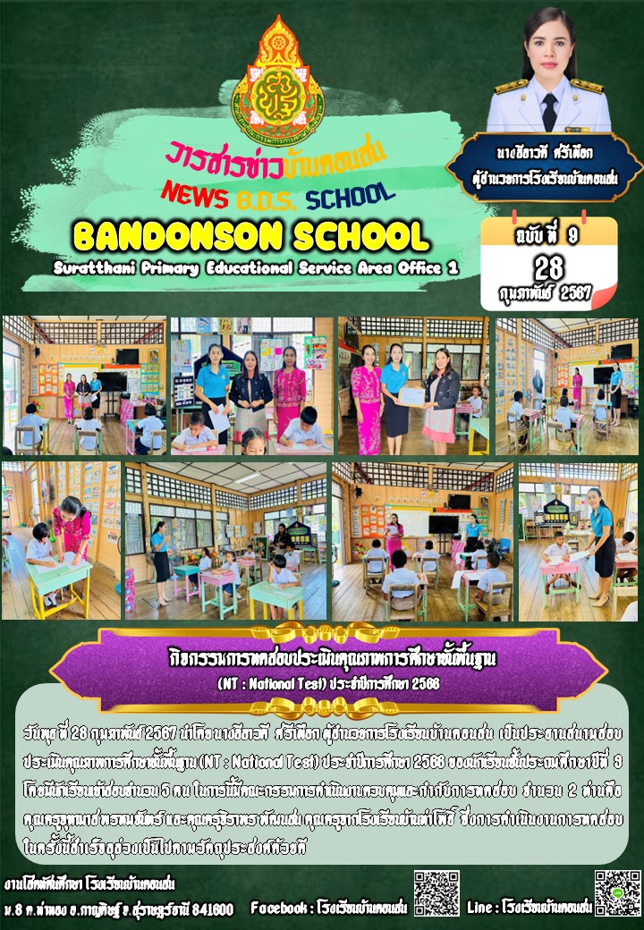 วันพุธ ที่ 28 กุมภาพันธ์ 2567 นำโดย นางลีลาวดี ศรีเผือก ผู้อำนวยการโรงเรียนบ้านดอนสน เป็นประธานสนามสอบประเมินคุณภาพการศึกษาขั้นพื้นฐาน (NT : National Test) ประจำปีการศึกษา 2566 ของนักเรียนชั้นประถมศึกษาปีที่ 3 โดยมีนักเรียนเข้าสอบจำนวน 5 คน ในการนี้มีคณะกรรมการดำเนินงานตวบคุมและกำกับการทดสอบ จำนวน 2 ท่านคือ คุณครูจุฑามาส พรหมจันทร์ และคุณครูจิราพร พัฒนสน คุณครูจากโรงเรียนบ้านท่าโพธิ์ ซึ่งการดำเนินงานการทดสอบในครั้งนี้สำเร็จลุล่วงเป็นไปตามวัตถุประสงค์ด้วยดี