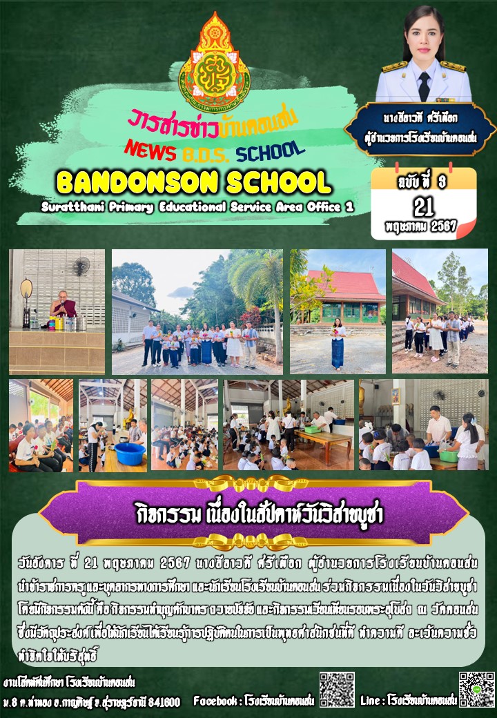 วันอังคาร ที่ 21 พฤษภาคม 2567 นางลีลาวดี ศรีเผือก ผู้อำนวยการโรงเรียนบ้านดอนสนนำข้าราชการครู และบุคลากรทางการศึกษา และนักเรียนโรงเรียนบ้านดอนสน ร่วมกิจกรรมเนื่องในวันวิสาขบูชาโดยมีกิจกรรมดังนี้ คือ กิจกรรมทำบุญตักบาตร ถวายปัจจัย และกิจกรรมเวียนเทียนรอบพระอุโบสถ ณ วัดดอนสน ซึ่งมีวัตถุประสงค์ เพื่อให้นักเรียนได้เรียนรู้การปฏิบัติตนในการเป็นพุทธศาสนิกชนที่ดี ทำความดี ละเว้นความชั่วทำจิตใจให้บริสุทธิ์