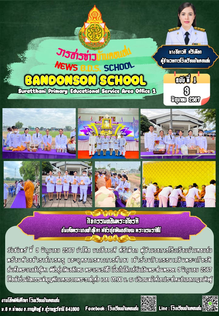 วันจันทร์ ที่ 3 มิถุนายน 2567 นำโดย นางลีลาวดี ศรีเผือก ผู้อำนวยการโรงเรียนบ้านดอนสนพร้อมด้วยข้าราชการครู และบุคลากรทางการศึกษา เข้าร่วมกิจกรรมเฉลิมพระเกียรติสมเด็จพระนางเจ้าสุทิดา พัชรสุธาพิมลลักษณ พระบรมราชินี เนื่องในโอกาสวันเฉลิมพระชนมพรรษา 3 มิถุนายน 2567โดยเข้าร่วมกิจกรรมทำบุญตักบาตรถวายพระราชกุศล เวลา 07.00 น. ณ บริเวณหน้าศาลาประชาคมอำเภอกาญจนดิษฐ์