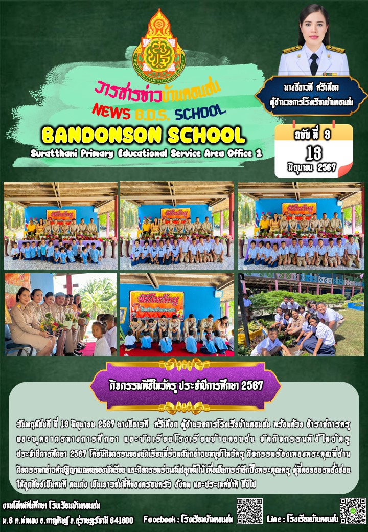 วันพฤหัสบดี ที่ 13 มิถุนายน 2567 นางลีลาวดี ศรีเผือก ผู้อำนวยการโรงเรียบ้านดอนสน พร้อมด้วย ข้าราชการครู และบุคลากรทางการศึกษา และนักเรียนโรงเรียนบ้านดอนสน จัดกิจกรรมพิธีไหว้ครู ประจำปีการศึกษา 2567 โดยมีกิจกรรมของนักเรียนที่ร่วมกันกล่าวบทบูชาไหว้ครูกิจกรรมร้องเพลงพระคุณที่สามกิจกรรมกล่าวคำปฏิญาณณตนของนักเรียนและกิจกรรมร่วมกันปลูกต้นไม้เพื่อเป็นการรำลึกถึงพระคุณครู ผู้ที่คอยอบรมสั่งสอนให้ลูกศิษย์เป็นคนดี คนเก่ง เป็นเยาวชนที่ดีของครอบครัว สังคม และประเทศชาติ สืบไป